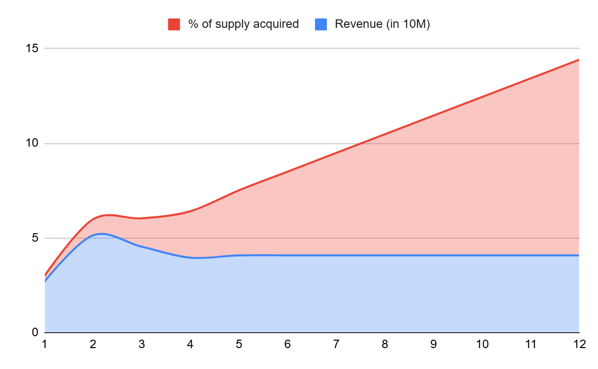 The calculations here are my own and always skewed toward the lower end, but HL is projected to acquire 10-15% of all circulating $HYPE by EOY, given current revenues and token price ($40m/month, $12).